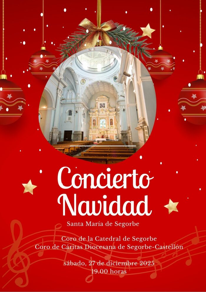 El Coro de la Catedral de Segorbe y el Coro de Cáritas Diocesana de Segorbe-Castellón ofreceran un concierto de Navidad, el próximo sábado día 27 de diciembre a las 19.00 horas en la Parroquia de Santa María de Segorbe, que este año cumple 100 años de historia.