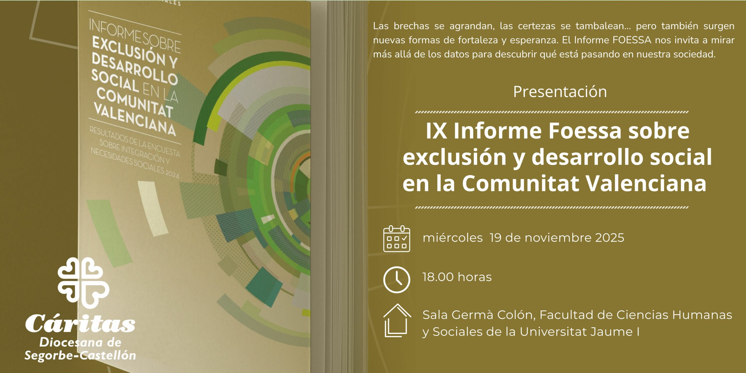 De la mano de Domingo Garcia Marzá, catedrático de Ética y Filosofía Política de dicha Facultad, será expuesto por Marina Sánchez-Sierra Ramos y María Moscardó Bolinches, técnicas de investigación de la Fundación Foessa, quienes nos trasladarán «la realidad que ES en nuestra Comunidad».
