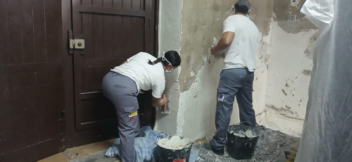 Este mes, se están llevando a cabo trabajos de reparación de paredes afectadas por humedades, así como tareas de lijado y pintura en diferentes espacios de la parroquia.