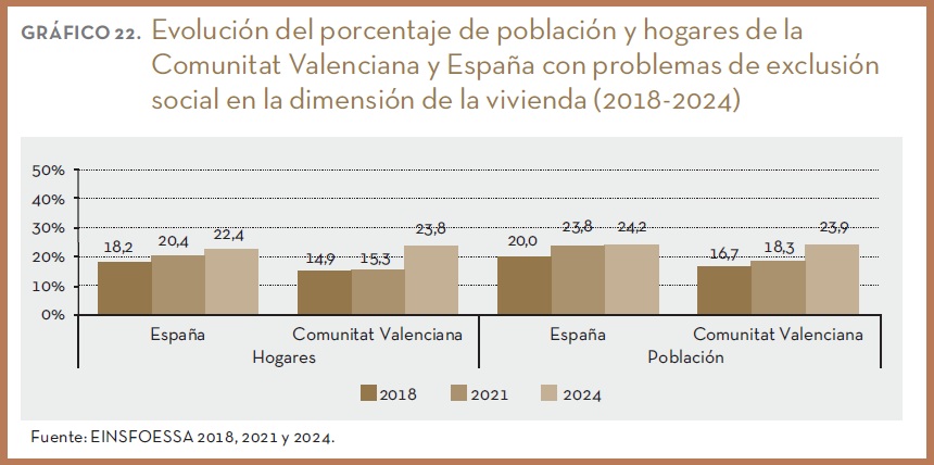Pero el pago del alquiler no es el único problema relacionado con la vivienda para las personas en la Comunitat Valenciana. Alrededor de 1,2 millones de personas en nuestro territorio tienen dificultades en el ámbito de la vivienda, entre los que destacan el millón de hogares que no puede afrontar gastos imprevistos de 800 € o más; los más de 450.000 que no pueden mantener la vivienda a una temperatura adecuada; los más de 38.500 que no disponen de sistema de evacuación de aguas sucias; o los más de 19.000 sin agua caliente, según destaca el Informe presentado esta mañana.