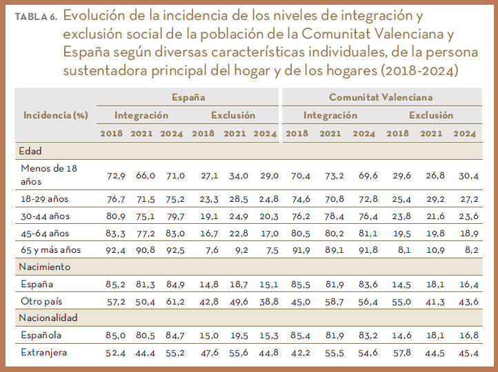 En cuanto al origen de las personas afectadas por la exclusión social, FOESSA destaca que «el 45,4% de las personas de nacionalidad extranjera en la Comunitat se encuentran en dicha situación».