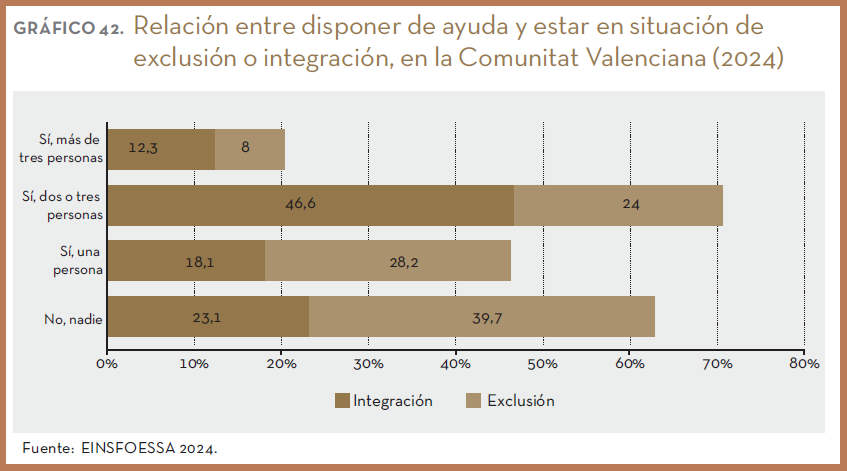 Es importante, además, tener en cuenta algunas de las consecuencias de esta exclusión social: 149.000 hogares en la Comunitat no tienen relaciones y no cuentan con ningún apoyo para situaciones de enfermedad o dificultad. Así, las personas en exclusión tienen más del doble de probabilidades de estar completamente desconectadas de su entono vecinal, lo que evidencia un mayor riesgo de aislamiento social incluso en contextos cotidianos como el barrio.